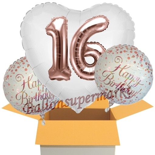 3 Luftballons zum 16. Geburtstag, sehr edel in Weiß und Roségold, ein goßer Herzluftballon mit beeindruckendem 3D-Effekt die Zahlen 1 und 6 sind nicht aufgedruckt, sondern von außen am Ballon angebracht, zwei holografischer Happy Birthday Folienballons in Roségold. Ein elegantes, großes Bouquet aus Luftballons zur Feier des 16. Geburtstages.