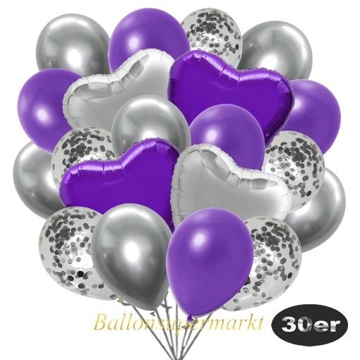 30er Luftballon-Set mit Folienballons, 9 Silber-Konfetti, 9 Metallic-Violett, 8 Chrome-Silber Luftballons, 2 Herzballons aus Folie Silber und 2 Herzballons aus Folie Lila