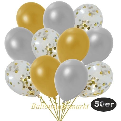 50er Luftballon-Set Metallic, 15 Gold-Konfetti, 18 Metallic-Silber und 17 Metallic-Gold Luftballons
