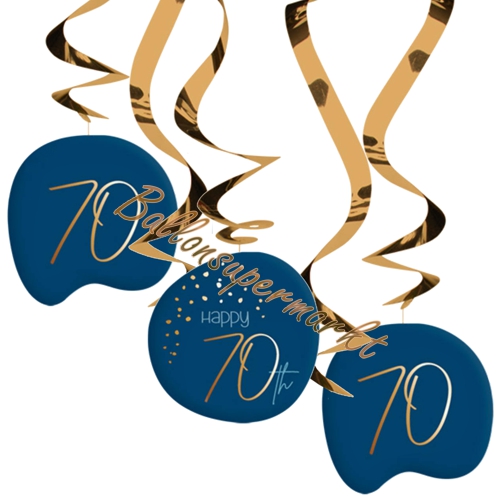 Hochwertige Swirl-Dekoration zum 70. Geburtstag in Dunkelblau und edlem Gold Metallic mit der Aufschrift: Happy 70th.