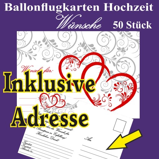 Ballonflugkarten Hochzeit - Wünsche für das Hochzeitspaar - 50 Postkarten zum Anhängen an Luftballons - Inklusive Adressendruck