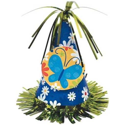 Das Gewicht für Helium-Luftballons ist ca.: 16,5 cm hoch und 9 cm breit, es wiegt 166 Gramm, es ist verziert mit einem Schmetterling grün-glänzender Folie und bedruckt mit Blumen, am oberen Ende sind Folienstreifen zur Verzierung angebracht. Eine Öse zum Anbinden von Luftballons mit Ballonband befindet sich am Gewicht.