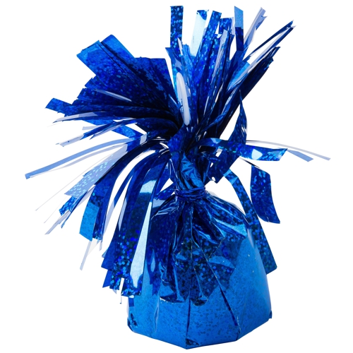 Das Gewicht für Helium-Luftballons ist ca.: 12,5 cm hoch und 5,5 cm breit, es wiegt 166 Gramm, es ist verziert und verpackt in blauer, holografisch glänzender Folie, am oberen Ende sind Folienstreifen zur Verzierung angebracht. Eine Öse zum Anbinden von Luftballons mit Ballonband befindet sich am Gewicht.