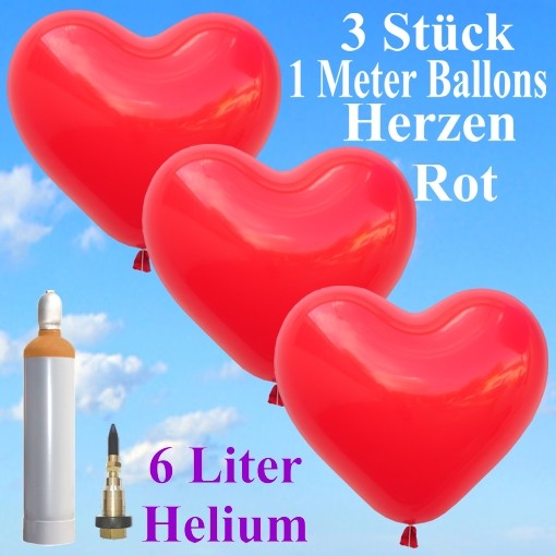 3 große, rote Latexballons, 1 Meter, Herz, mit Heliumflasche und Zubehör