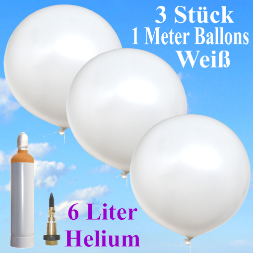3 große, weiße Latexballons, 1 Meter, Rund, mit Heliumflasche und Zubehör