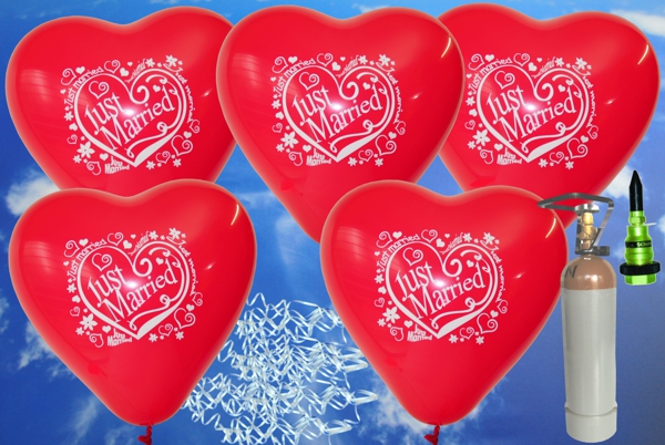 Rote Herzluftballons "Just Married" frisch verheiratet, zur Hochzeitsfeier