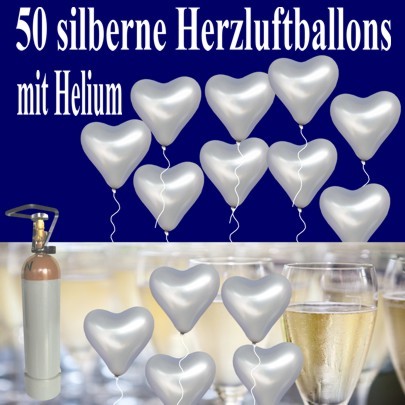 Herzluftballons mit Helium in Silber, Midi-Set zur Silbernen Hochzeit, 50 Ballons und Ballongasflasche