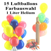 Mini-Set 2A, 15 bunte Luftballons (Farbauswahl) 1 Liter Helium