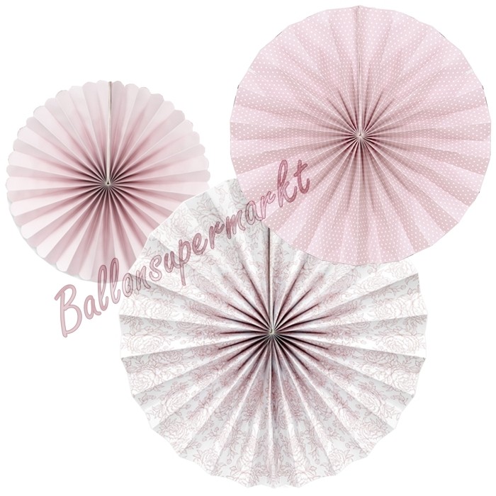Fächer-Set, bestehend aus 3 Stück Deko-Rosetten in zartem Altrosé mit floralem Touch, 1 große Rosette " Pfingstrosen" mit 40 cm, 1 mittlere Rosette "Punkte" mit 32 cm und eine kleine, unifarbene Rosette mit 23 cm Ø.