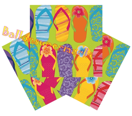 Party-Servietten, bunt bedruckt mit Flip Flops. Servietten-Dekoration zur Mottoparty mit dem Thema: Tropen, Hawaii, Strand und Meer.