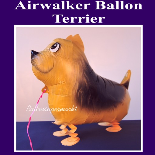 Airwalker Folienballon als Terrier. Der Ballon aus Folie ist mit Helium befüllt. Lustiger Tierballon, den man an der Leine spazieren führen kann. Durch den Effekt der Helium-Füllung geht der Terrier mit lustigen Schritten an der Leine. Ein Riesen-Gag. Natürlich schwebt der Tierballon nicht, denn die Pfoten des Terriers sind mit Gewichten beschwert. Auch wenn der Airwalker-Ballon im Raum steht und ein kleiner Windstoß kommt, läuft der Terrier wie in Echt.