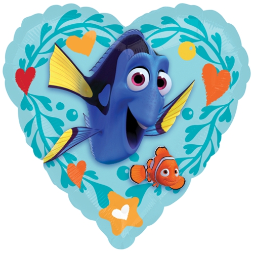 Luftballon aus Folie in Herzform, bunt bedruckt mit Dorie und Nemo, den beliebten Fischen aus Disney Pixars: Findet Nemo & Findet Dorie.