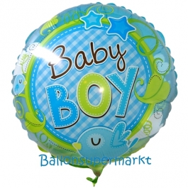 Runder Luftballon aus Folie in Blau und Grün, bedruckt mit niedlichen Vögelchen und der Aufschrift: Baby Boy.