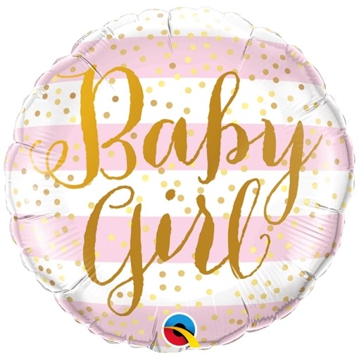 Runder Luftballon aus Folie in mit rosafarbenen und weißen Streifen, bedruckt in Gold mit Punkten und der Aufschrift: Baby Girl.
