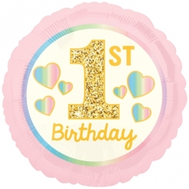 Runder Luftballon aus Folie in zartem Rosa, bedruckt mit bunten Herzen und der goldenen Aufschrift: 1st Birtday.