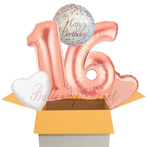 5 Luftballons zum 16. Geburtstag in edlem Roségold, zwei goße Zahlenluftballons Zahl 1 und 6, ein holografischer Happy Birthday Folienballon in Roségold, 2 Herzballons in Roségold und Weiß. Ein großes, elegantes Bouquet aus Luftballons zur Feier des 16. Geburtstages.