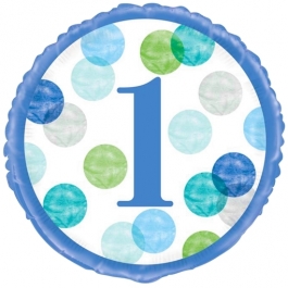 Runder Luftballon aus Folie zum 1. Geburtstag in Weiß, bedruckt mit bunten Punkten in Blau- und Grüntönen und der Zahl 1.