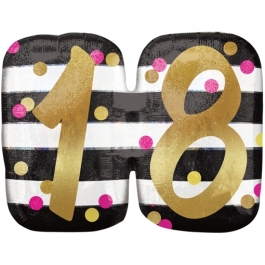 Großer, glitzernder Luftballon aus Folie, bedruckt mit Streifen, Punkten und der Zahl 18.