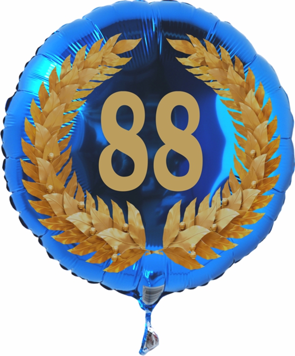 Blauer, runder Luftballon, bedruckt mit der Zahl 88 in einem goldenen Lorbeerkranz.
