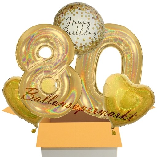 5 Luftballons zum 80. Geburtstag in glitzerndem Gold, zwei große, holografische Zahlenluftballons Zahl 8 und 0, ein holografischer Happy Birthday Folienballon und 2 holografische Herzballons in Gold. Ein großes, elegantes Bouquet aus Luftballons zur Feier des 80. Geburtstages.