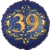 Runder Luftballon aus Folie in Marineblau mit edler Satin-Optik, bedruckt mit Luftschlangen, Sternen, Konfetti und der Zahl 39 in Gold.