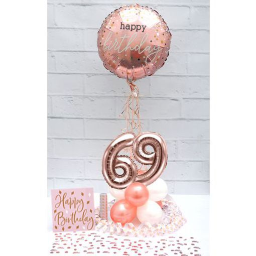 Dekoratives Partydeko-Set zum Geburtstag mit der Geburtstagszahl 69. Mit diesem attraktiven Set gestalten Sie den 69. Geburtstag auf festliche und kreative Art. Mit wenigen Handgriffen dekorieren Sie den Geburtstagstisch mit der wunderschönen Tischdekoration, bestehend aus 8 Luftballons 12 cm in Roségold und Weiß (Luftfüllung), 1 Folienballon Zahl 6, 35 cm (Luftfüllung), 1 Folienballon Zahl 9, 35 cm (Luftfüllung) und 1 Folienballon "Happy Birthday" 45 cm (Luft- oder Heliumfüllung)