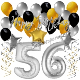 Happy Birthday Deko-Set zum 56. Geburtstag in Gold, Silber und Schwarz, 34 Teile bestehend aus: