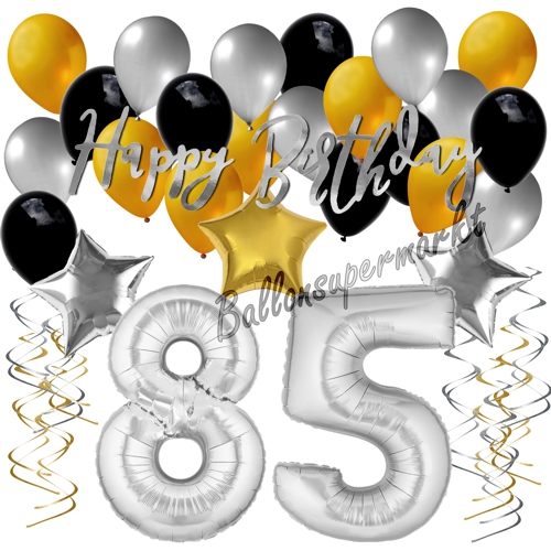 Happy Birthday Deko-Set zum 85. Geburtstag in Gold, Silber und Schwarz, 34 Teile bestehend aus:
