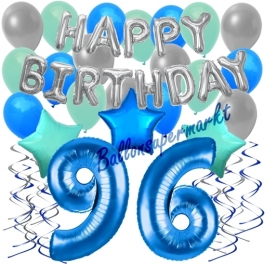 Happy Birthday Deko-Set zum 96. Geburtstag in Blau, Silber und Aquamarin, 34 Teile bestehend aus: