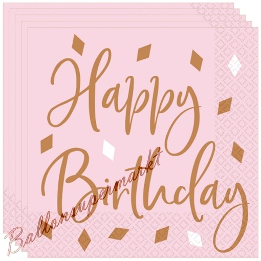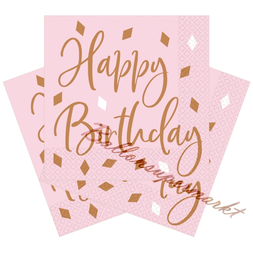 Elegante Servietten zum Geburtstag in zartem Rosa, Gold und Weiß mit der Aufschrift: Happy Birthday.