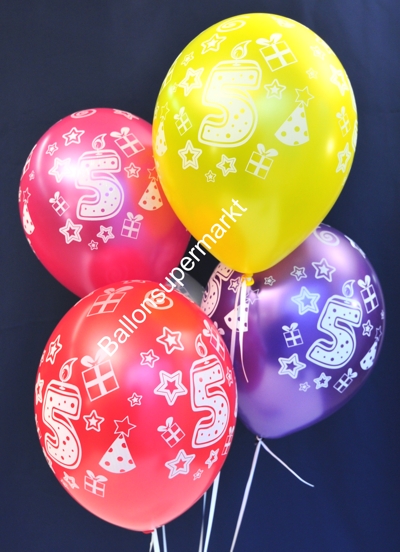 Ballons mit der Zahl 5 in den Metallic-Farben: Blau, Rot, Silber, Violett, Gelb, Pink.