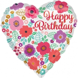 Herzluftballon aus Folie, bedruckt mit bunten Blumen und der Aufschrift: Happy Birthday.
