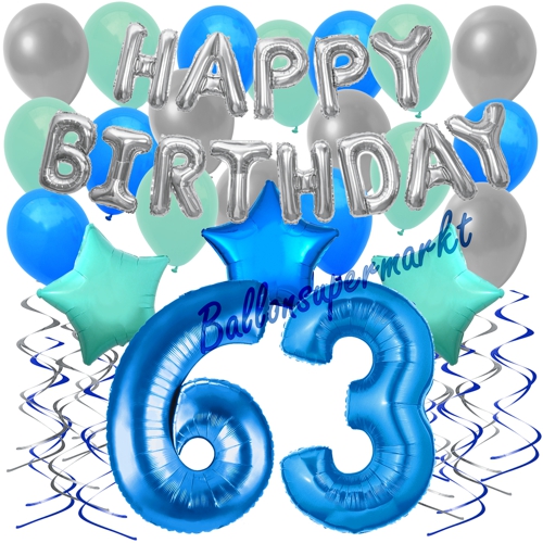 34-teiliges Geburtstagsdeko-Set mit Luftballons, Happy Birthday Blue zum 63. Geburtstag
