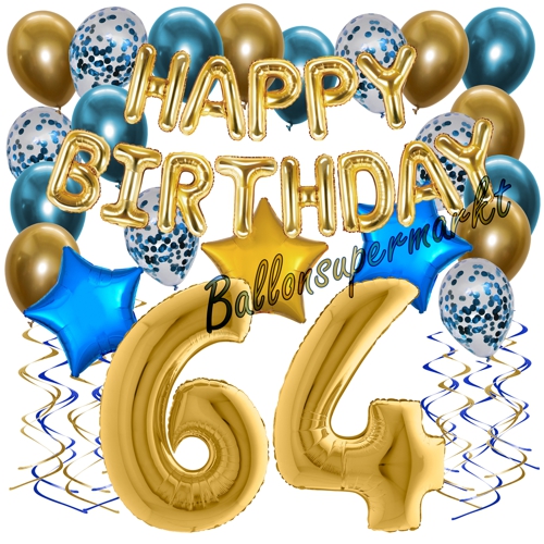 Happy Birthday Chrome Blue & Gold, Geburtstagsdeko-Set mit Luftballons zum 64. Geburtstag, 43-teilig