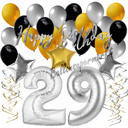 Happy Birthday Deko-Set zum 29. Geburtstag in Gold, Silber und Schwarz, 34 Teile bestehend aus: