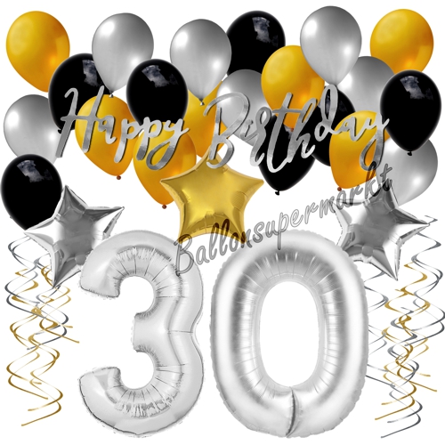 Happy Birthday Deko-Set zum 30. Geburtstag in Gold, Silber und Schwarz, 34 Teile bestehend aus: