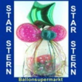 1 Geschenkballon gefüllt mit hübschen, dekorativen Dekorationsartikeln, 1 Folienballon 45cm "Stern" inklusive Ballongas, 2x Latexballons 30cm "Sternchen" und 3x Latexherzen 12cm, 2 Modellierballons, einer als als Untersetzer und Dekoration mit Zierbändern.