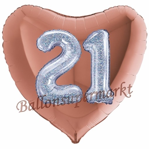 Großer Luftballon in Herzform aus Folie in zartem Roségold. Die große Zahl 21 in glitzerndem Silber ist nicht aufgedruckt, sondern von außen am Ballon angebracht, wodurch sie sich abhebt und ein eindrucksvoller 3D Effekt entsteht.