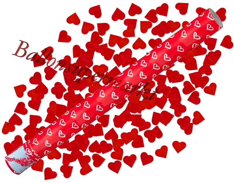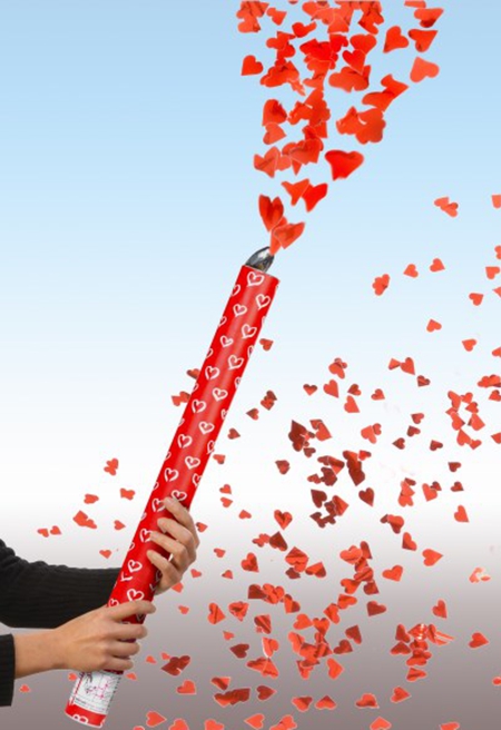 Durch einen einfachen Dreh werden rote Herzen bis zu 6- 8 Meter in die Luft katapultiert. Das besondere Highlight zu Hochzeit, Party und Event: Die Konfettikanone mit Herzchen.