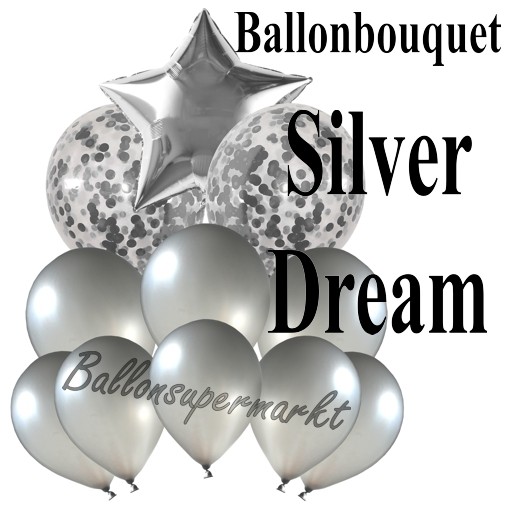 Mit dem Ballon-Bouquet "Silver Dream" ist das Fest schon fast perfekt. Schnell und einfach zaubern Sie eine effektvolle Ballondekoration zu jedem Anlass. Überraschen Sie Ihre Gäste mit den wunderschönen Ideen aus dem Ballonsupermarkt.