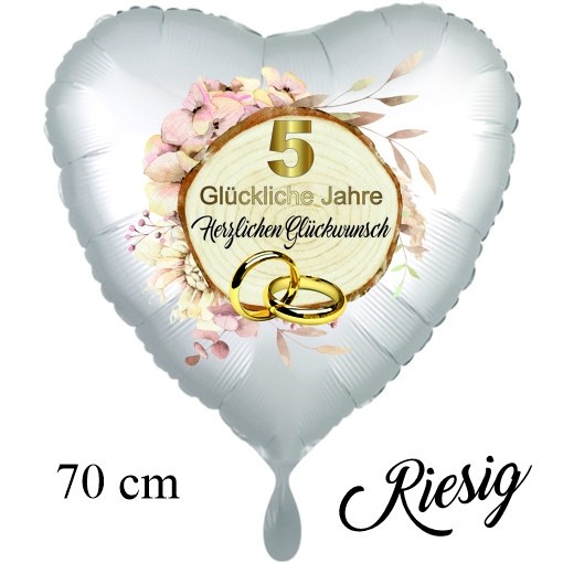 Zur Hölzernen Hochzeit - Herzlichen Glückwünsch, Herzballon 70 cm, Satin de Luxe, weiß inklusive Helium-Ballongas