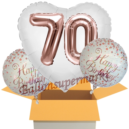 3 Luftballons zum 70. Geburtstag, sehr edel in Weiß und Roségold, ein goßer Herzluftballon mit beeindruckendem 3D-Effekt die Zahlen 7 und 0 sind nicht aufgedruckt, sondern von außen am Ballon angebracht, zwei holografischer Happy Birthday Folienballons in Roségold. Ein elegantes, großes Bouquet aus Luftballons zur Feier des 70. Geburtstages.