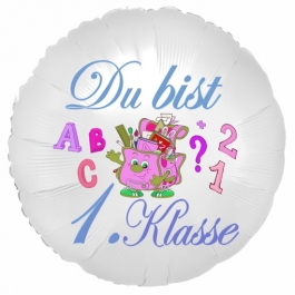 Du bist 1. Klasse. Satin-Weißer, runder Luftballon zum Schulanfang, zur Einschulung, inklusive Helium-Ballongas