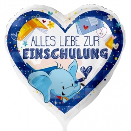 Alles Liebe zur Einschulung. Weißer, herzförmiger Luftballon zum Schulanfang, blau, zur Einschulung, ohne Helium