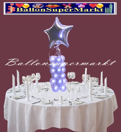 Tischdekorationen und kleinere Ballondekorationen zu Silvester. Standdekoration mit Stern aus Luftballons. Jede Deko mit einem Folien-Luftballon Stern in der Größe von 45 cm, der mit Helium gefüllt ist, an Deko-Zierband über einer kleinen Ballondeko-Säule schwebt. Die Deko-Säule besteht aus Mini-Luftballons. Die Dekorationen sind jeweils ca.: 100 cm hoch und 45 cm breit.