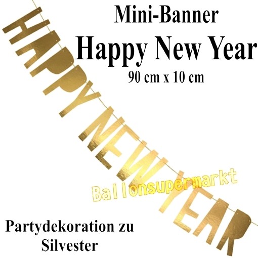 Goldenes Mini Party Banner zu Silvester, edel und schlicht gestalteter Schriftzug: Happy New Year - Frohes neues Jahr.