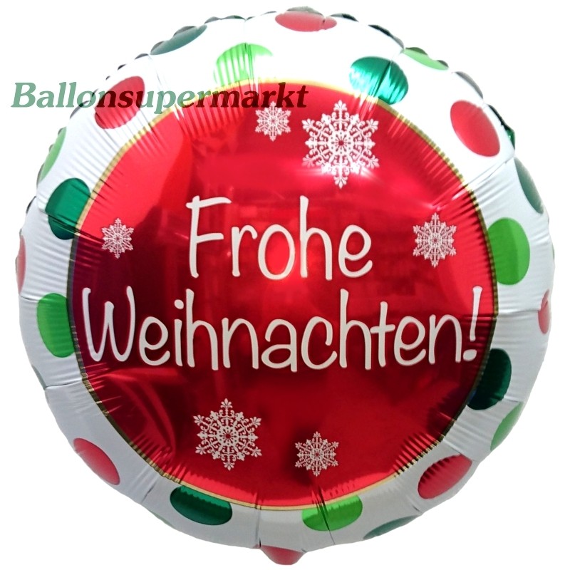 Runder Luftballon aus Folie, bunt bedruckt mit Punkten, Schneeflocken und der Aufschrift: Frohe Weihnachten!