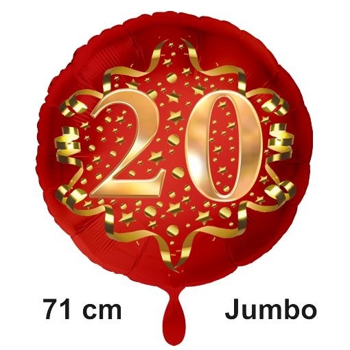 Jumbo Luftballon aus Folie zum 20. Geburtstag, Rot/Gold, 71 cm, rund, inklusive Helium