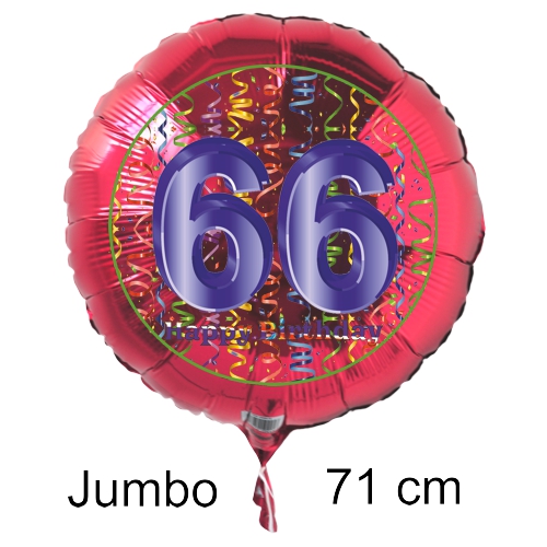 Großer, runder Luftballon aus Folie in glänzendem Rot, bedruckt mit Konfetti und Luftschlangen, der Zahl 66, 3D metallic blau, untermalt mit "Happy Birthday".