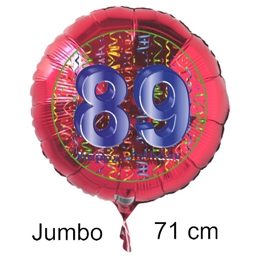 Großer, runder Luftballon aus Folie in glänzendem Rot, bedruckt mit Konfetti und Luftschlangen, der Zahl 89, 3D metallic blau, untermalt mit "Happy Birthday".